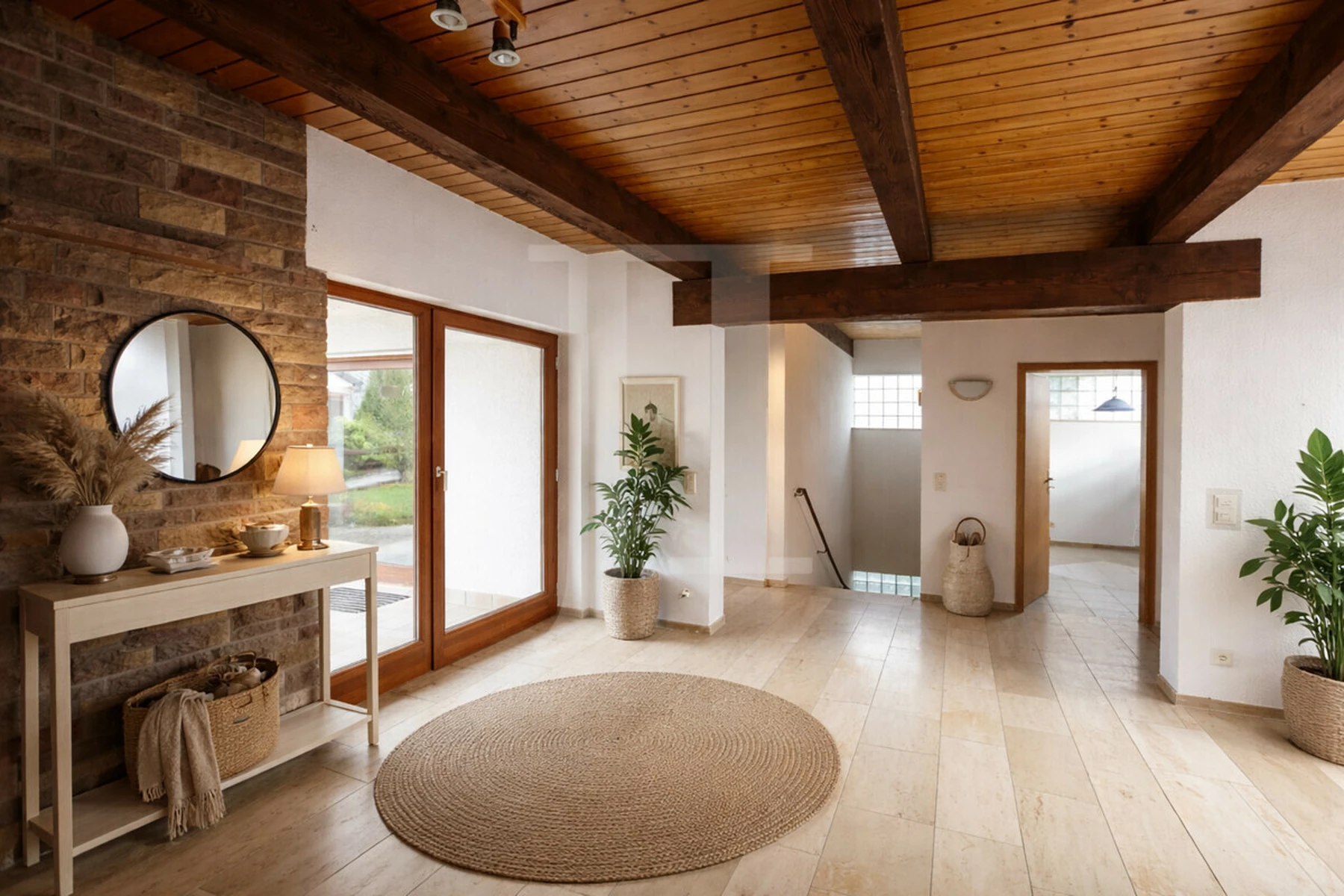 Schon beim Betreten des Hauses eröffnet sich ein besonderes Raumgefühl: Der großzügige Eingangsbereich empfängt Sie mit einem direkten Blick ins Grüne und schafft ein angenehmes Raumgefühl. Auf der Hauptwohnebene im Erdgeschoss erwarten Sie insgesamt vier gut geschnittene Zimmer, darunter ein helles Schlafzimmer, ein gemütliches Kinderzimmer sowie ein einladender Wohn- und Essbereich. Ein stilvoller Kamin dient hier nicht nur als Blickfang, sondern auch als atmosphärischer Raumtrenner.